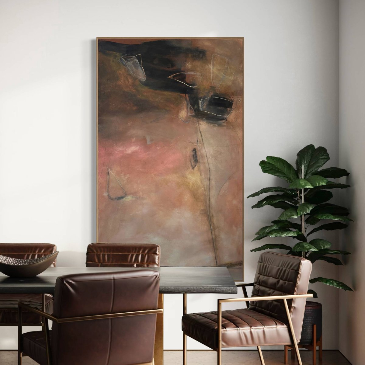 Cheryl Harrisons Reading Riverstone presents an abstract composition dominated by earthy tones. Bold and subtle gestural marks in ochre, tan, brown, black, grey, and blush pink create a dynamic surface. Organic, outlined forms float within the rich, layered acrylic, evoking natural elements. A strong vertical line anchors the piece, while a dark band at the top grounds the warm, diffused colors below. This original painting, initialed on the front and accompanied by a Letter of Authenticity, is sealed for protection.