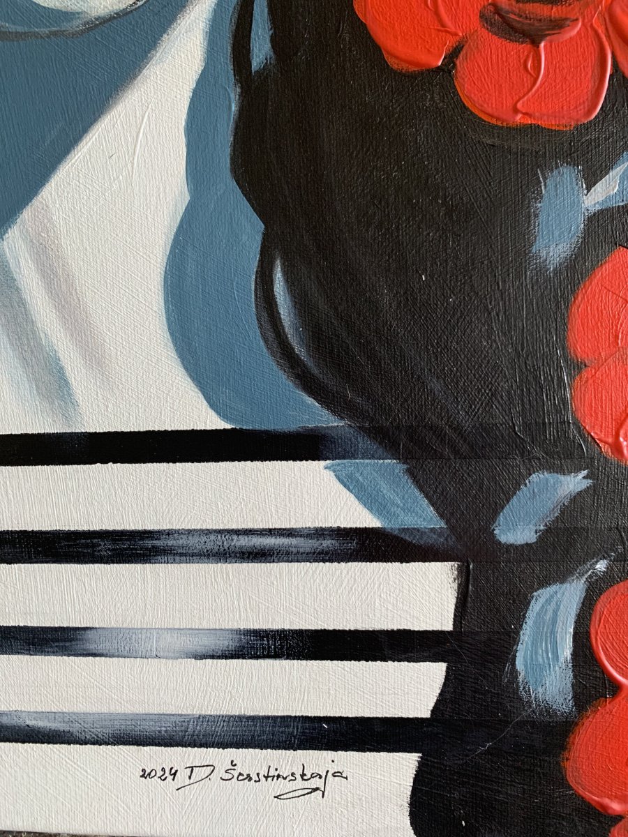 Set against sharp black-and-white stripes, the painting explores contrast as a visual language: softness against structure, emotion against restraint. The flowers appear to emerge from within, dissolving the boundary between identity and nature.