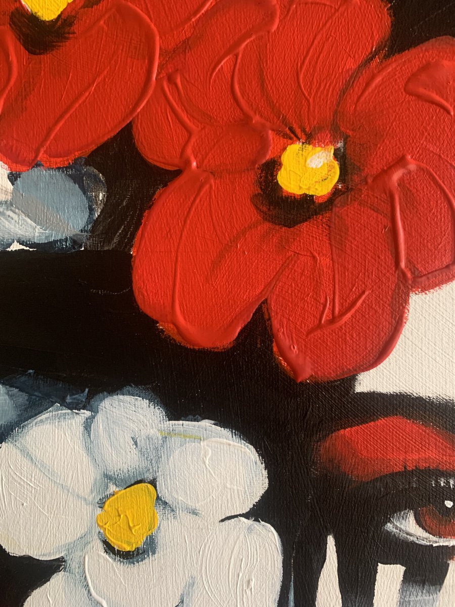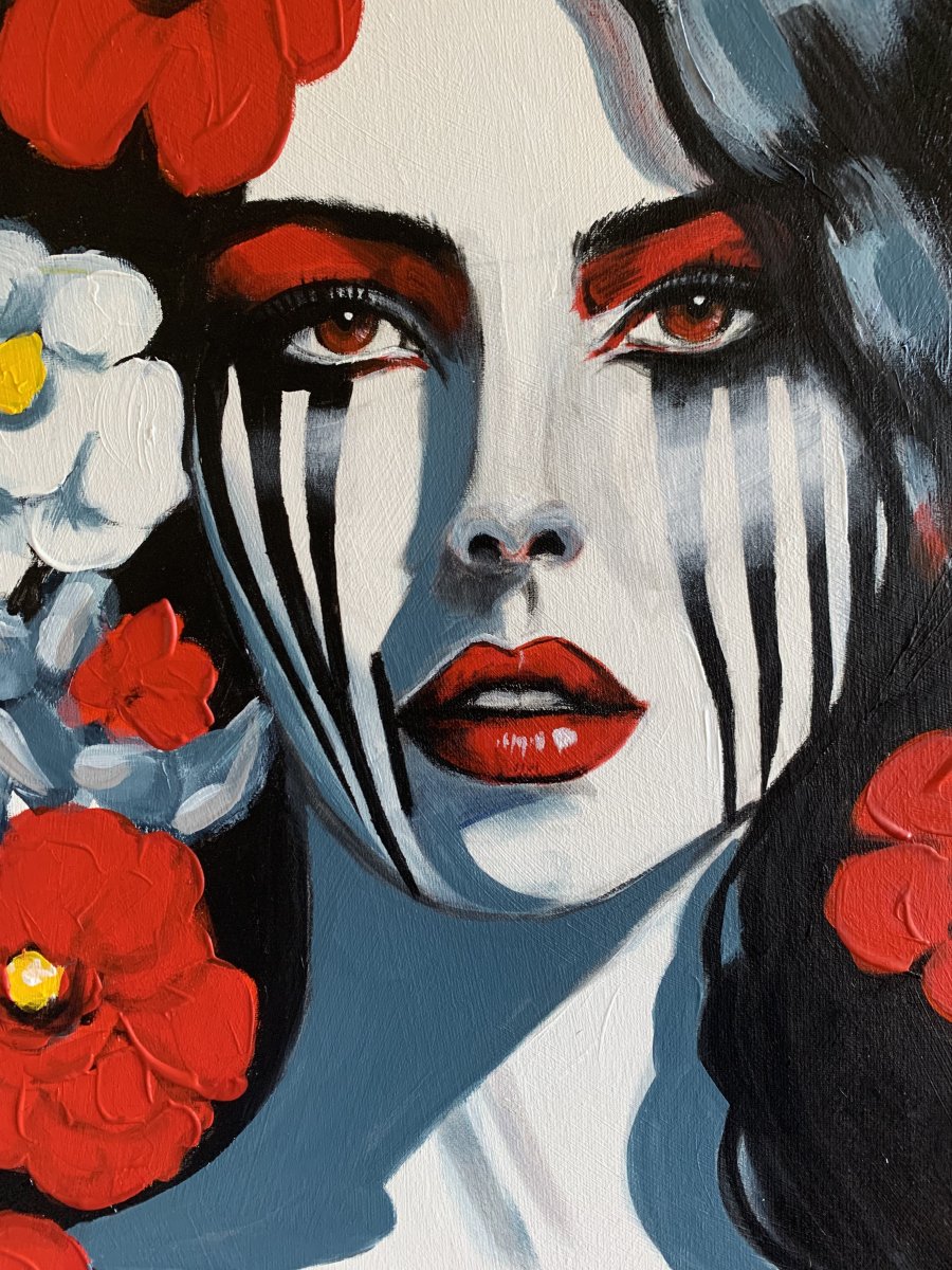 Floral Enigma is a striking contemporary portrait where graphic precision meets symbolic intensity. The woman’s face, marked by bold black tears and framed by vivid red and white blossoms, conveys a powerful duality - strength and vulnerability held in perfect tension. Her unwavering gaze anchors the composition with quiet authority.