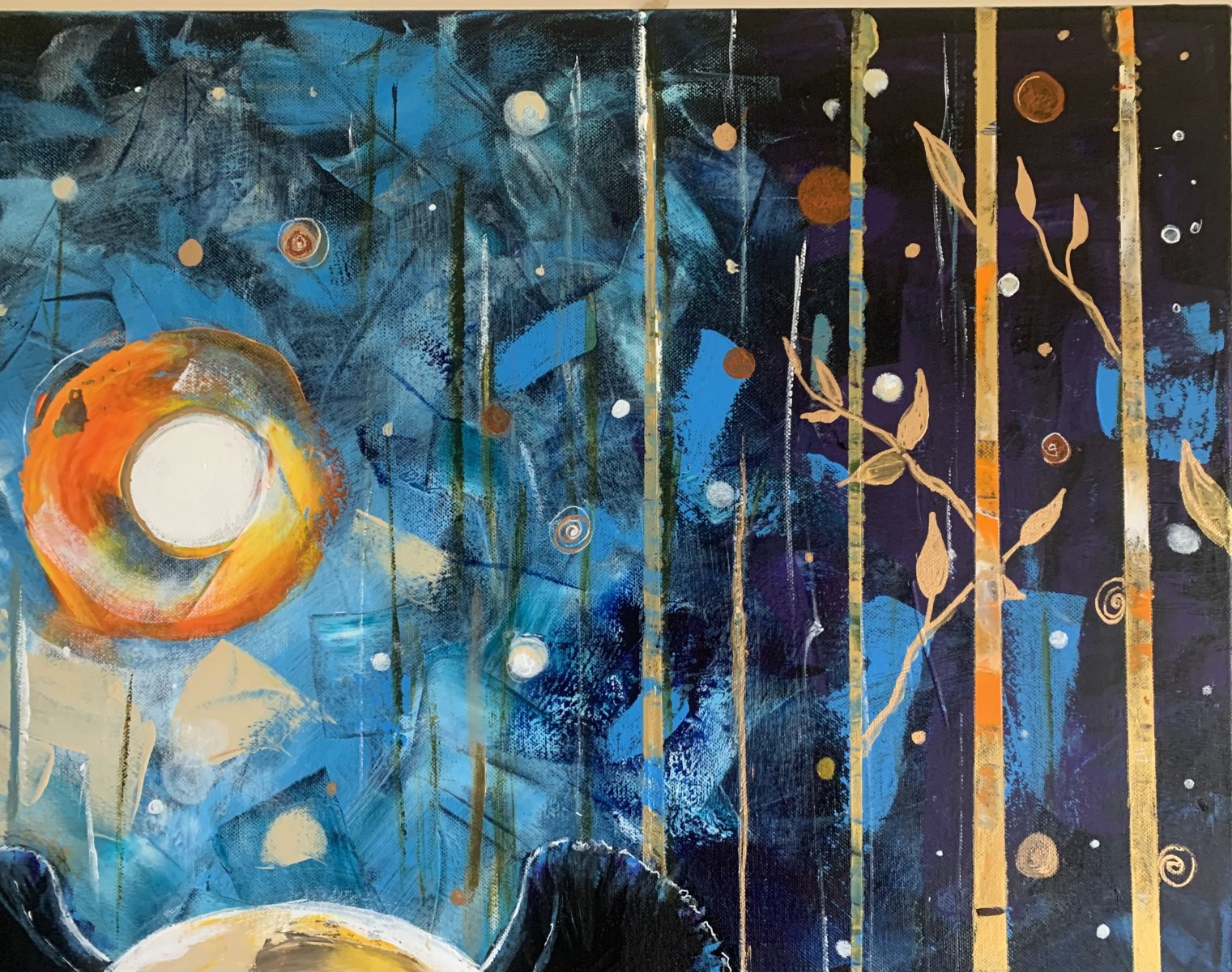 Vertical lines of trees and falling light add rhythm and movement to the composition, while layered textures and rich color contrasts build depth across the surface. The interplay of midnight blues, turquoise tones, and radiant orange highlights gives the painting both vibrancy and calm.