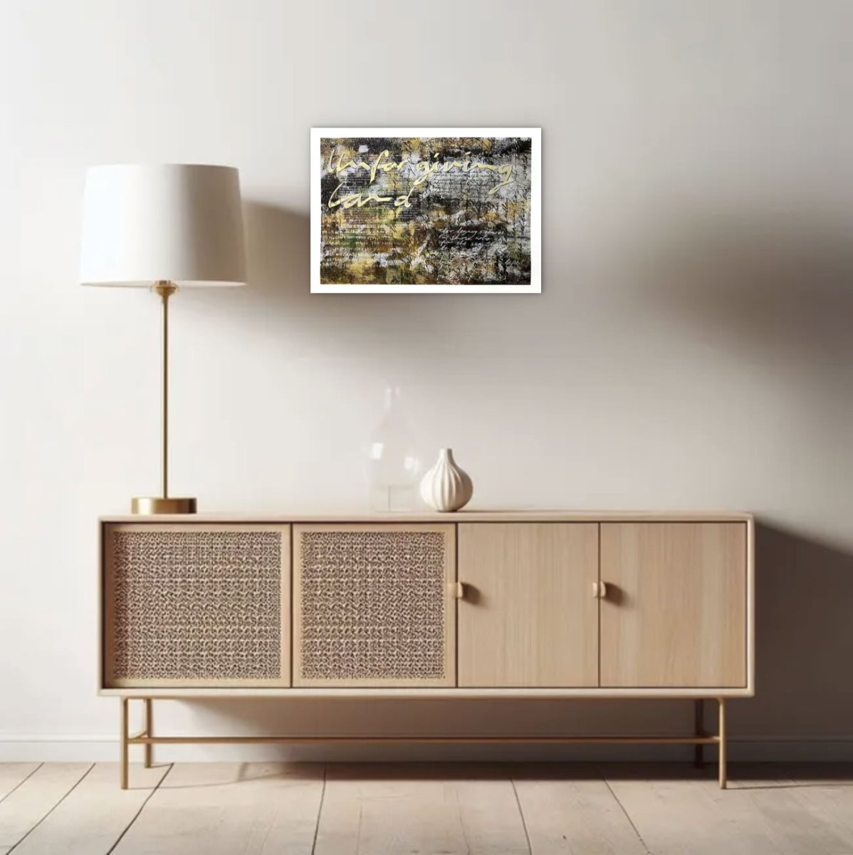 This abstract artwork in earth tone colors is inspired by ancient history. The handwritten texts and screen printed texts in it refer to what the wold must have been like thousands of years ago.