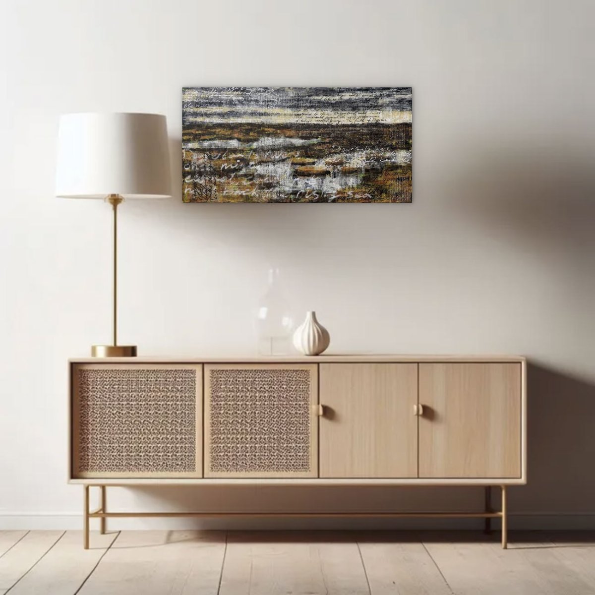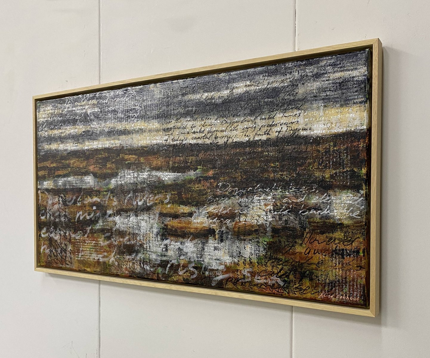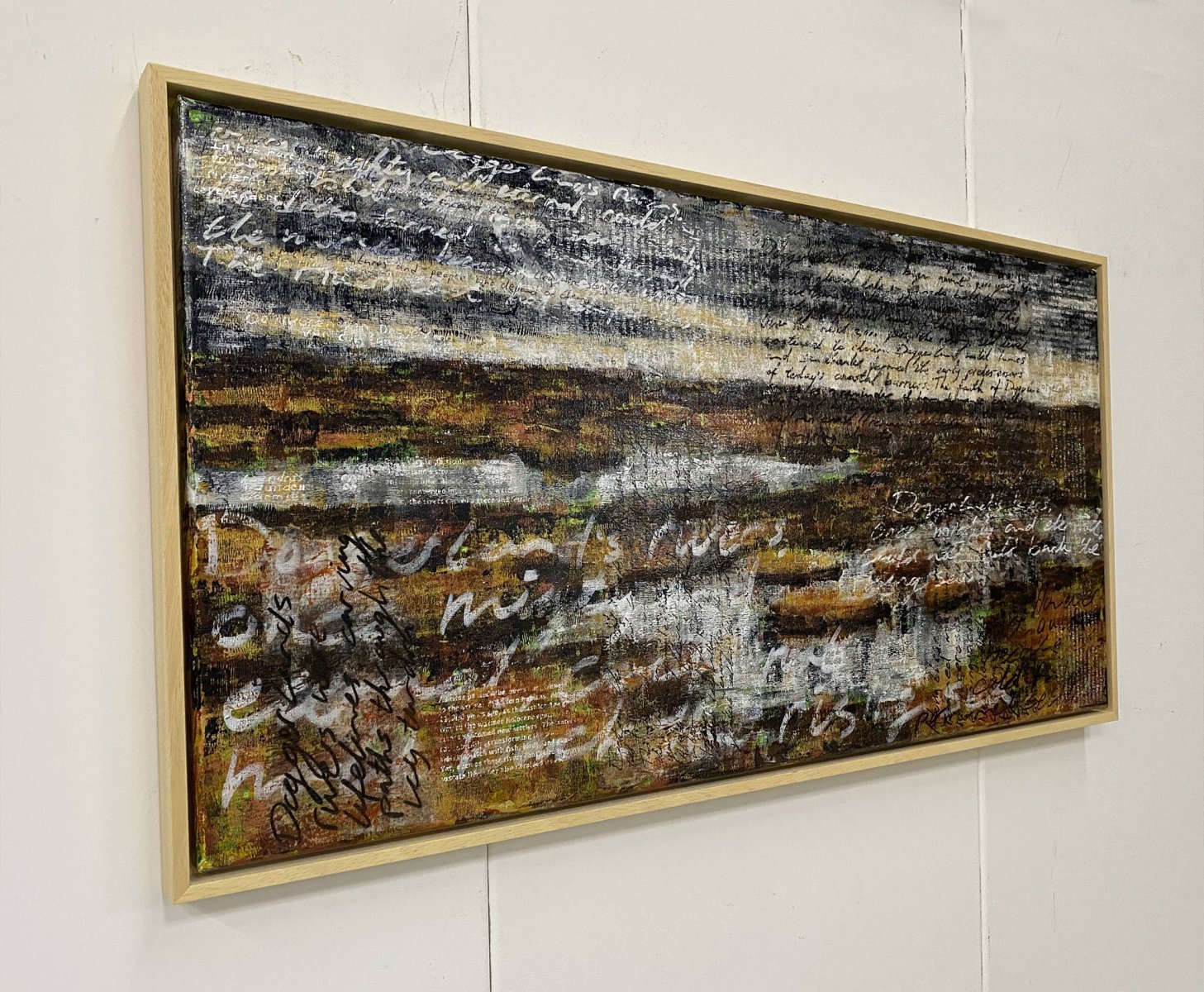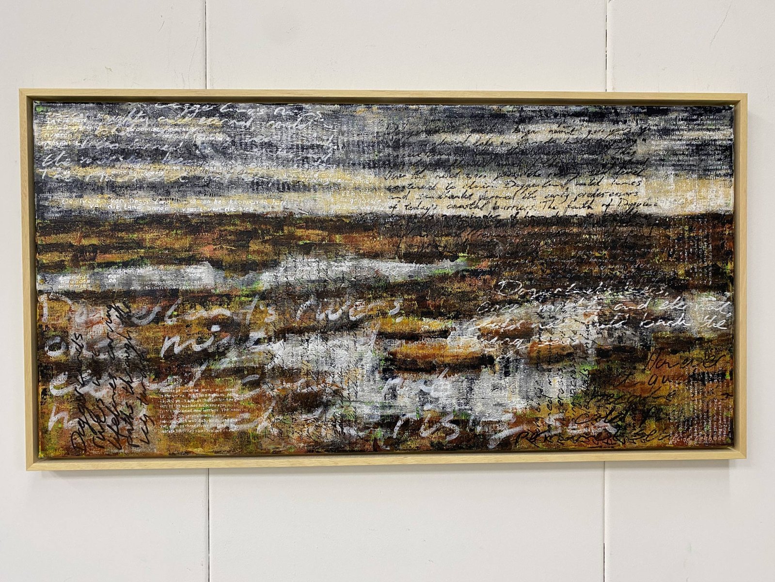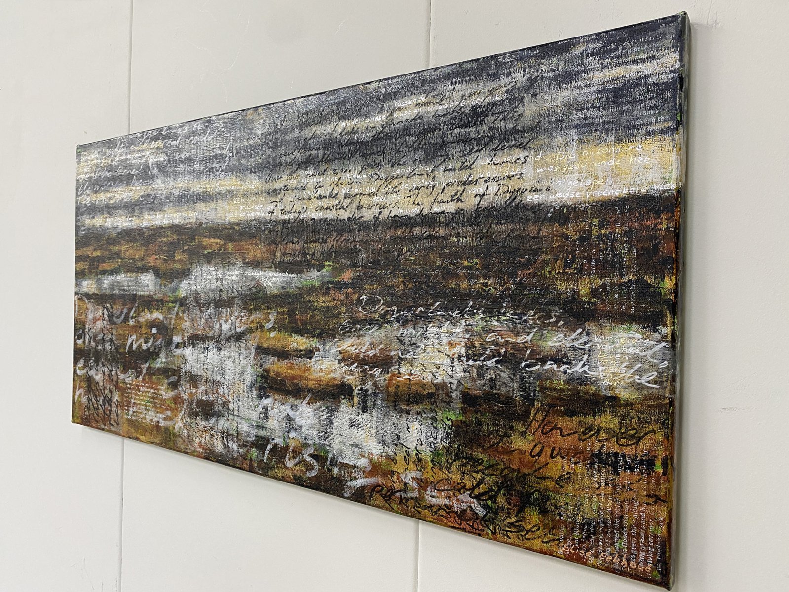 This painting reflects on Doggerland, the vast land that once connected Britain to continental Europe before it disappeared beneath the rising seas. This drowned landscape speaks not only of ancient history but also of our present time. Rising sea levels and climate change once again threaten coastlines, echoing the fate of this forgotten land. The work is layered with text in silver foil, ink, acrylic markers, and screen print. Words shimmer and fade depending on the light, just as memory and history shift between presence and absence. The reflective surfaces act like water: sometimes concealing, sometimes revealing. For me, Doggerland embodies both resilience and fragility. It was once a fertile corridor of life, later drowned by the unstoppable sea. In my work, I revisit this lost world not as a reconstruction, but as a mirror. What is drowned may return as a warning.