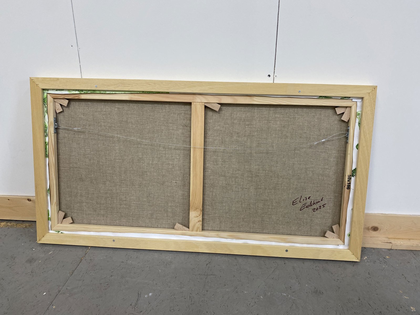 This contemporary artwork is made with acrylics on fine linnen. The handwritten texts and the screen printed lyrics refer to the ancient land that is now on the bottom of the North Sea. Some of the handwritten texts are gilded with silver and gold colored foil. This makes the texts seem to appear and disappear depending on how the light falls on them.