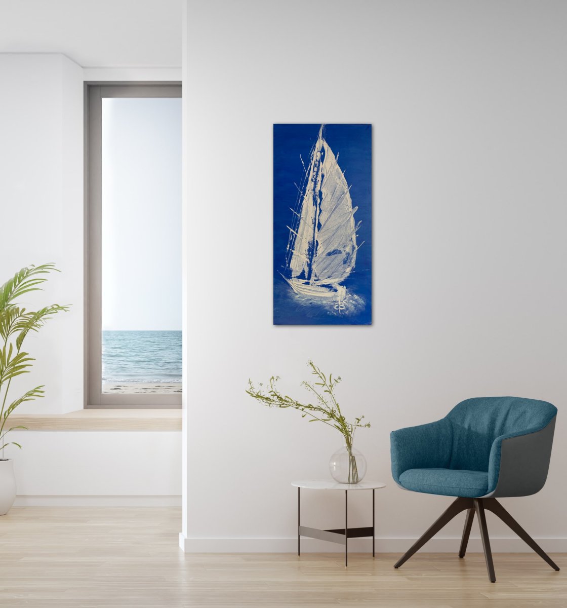 Simply capturing a sailing boat in motion with a palette knife is what I have done here for the second time, having previously achieved a clear luminous blue in various glazes. A quick goodbye and it's up and away... It leaves you standing on the coast, waving goodbye.