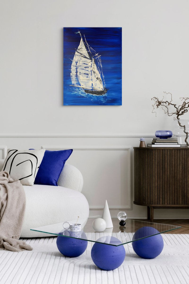 Sailing is always a wonderful experience for adventurous people, because people and water are inseparably linked. Simply capturing a sailing boat in motion with a palette knife, having previously achieved a clear luminous blue in various glazes. A quick goodbye and it's up and away....