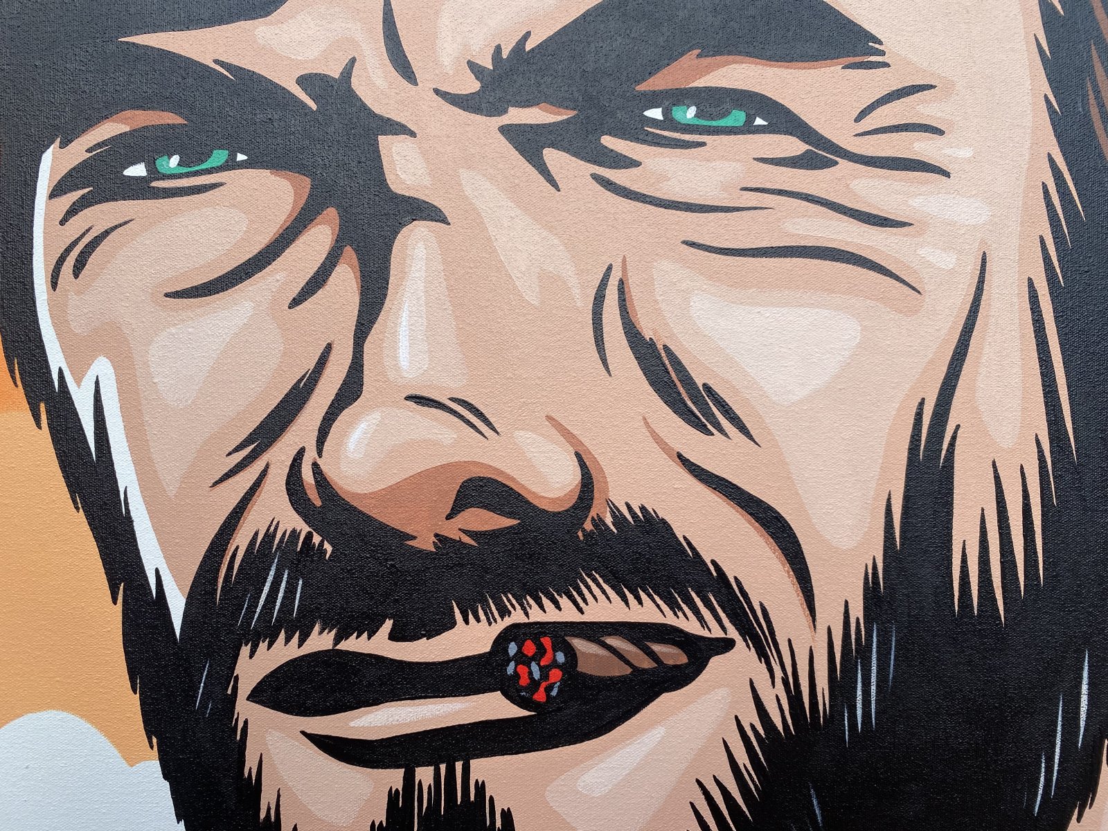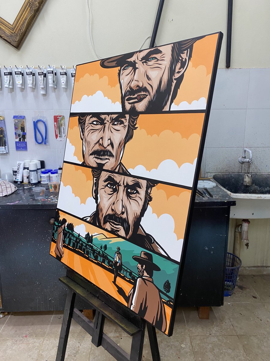 Original comic book style pop art painting of the standoff scene from the end of the movie 'The Good, The Bad and The Ugly'. Clint Eastwood, Lee Van Cleef and Eli Wallach shoot it out.