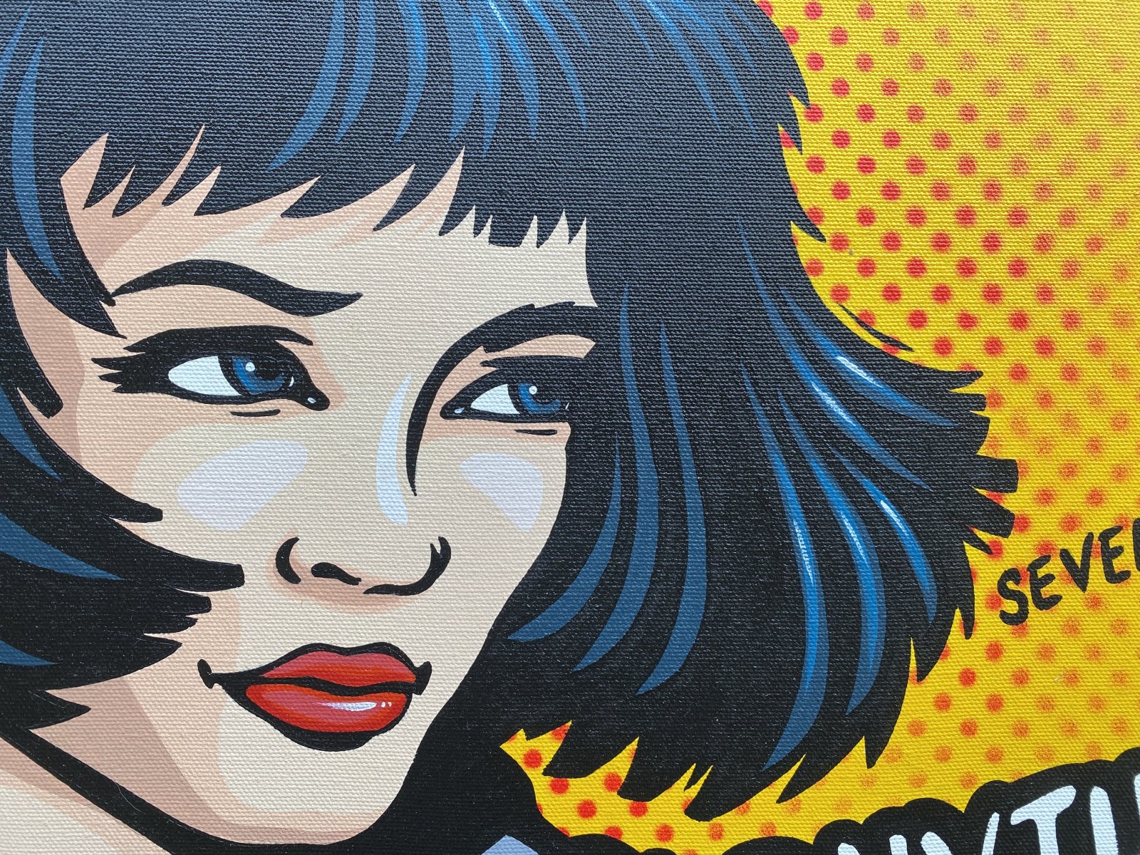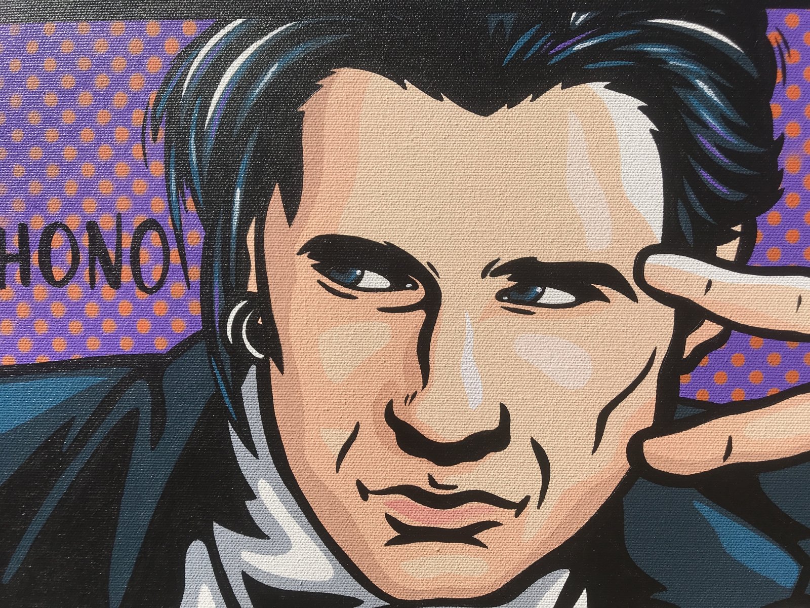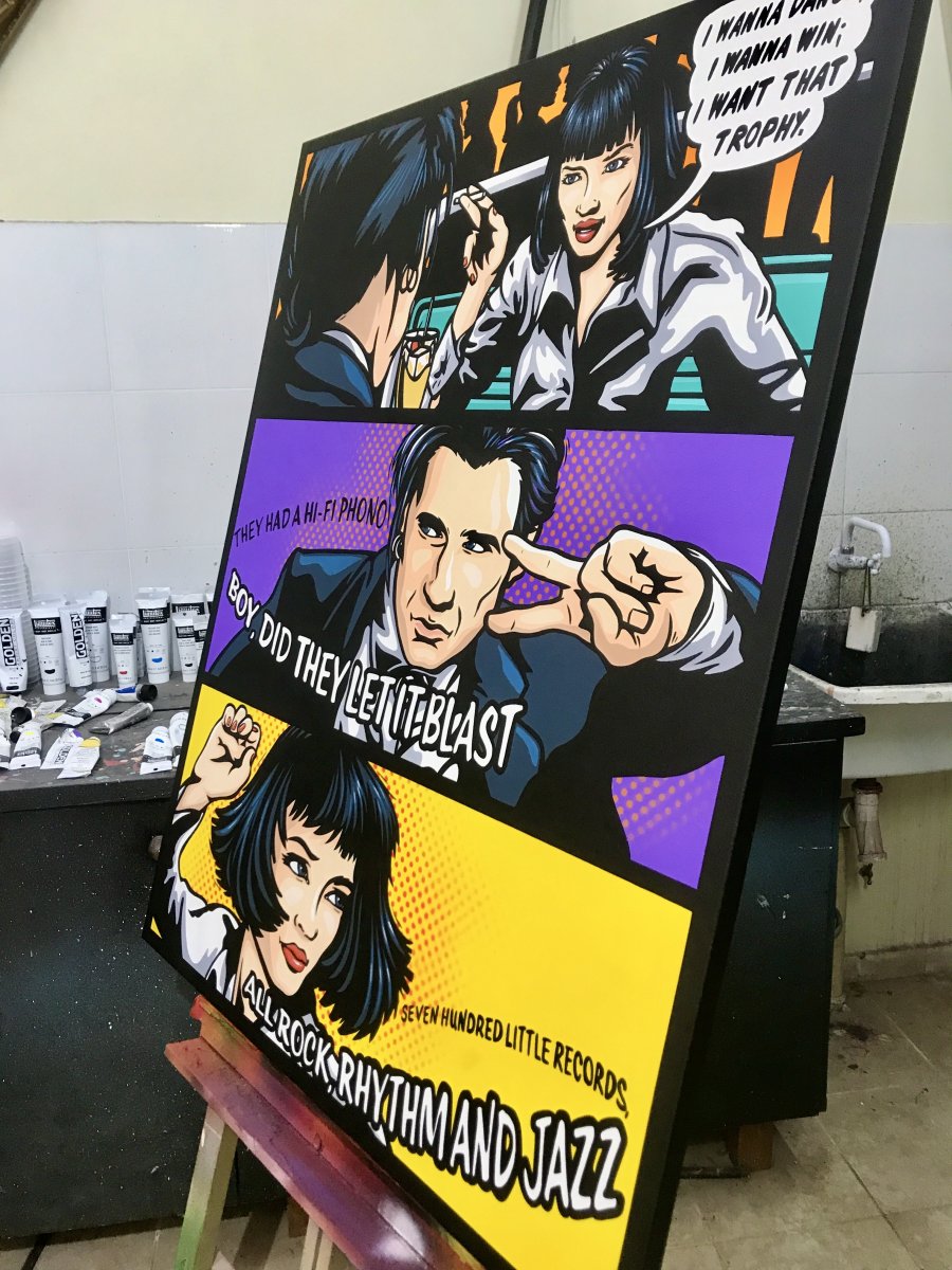 Comic book style pop art painting of the iconic dance scene from the movie Pulp Fiction. John Travolta and Uma Thurman go after Jack Rabbit Slim's dance trophy.