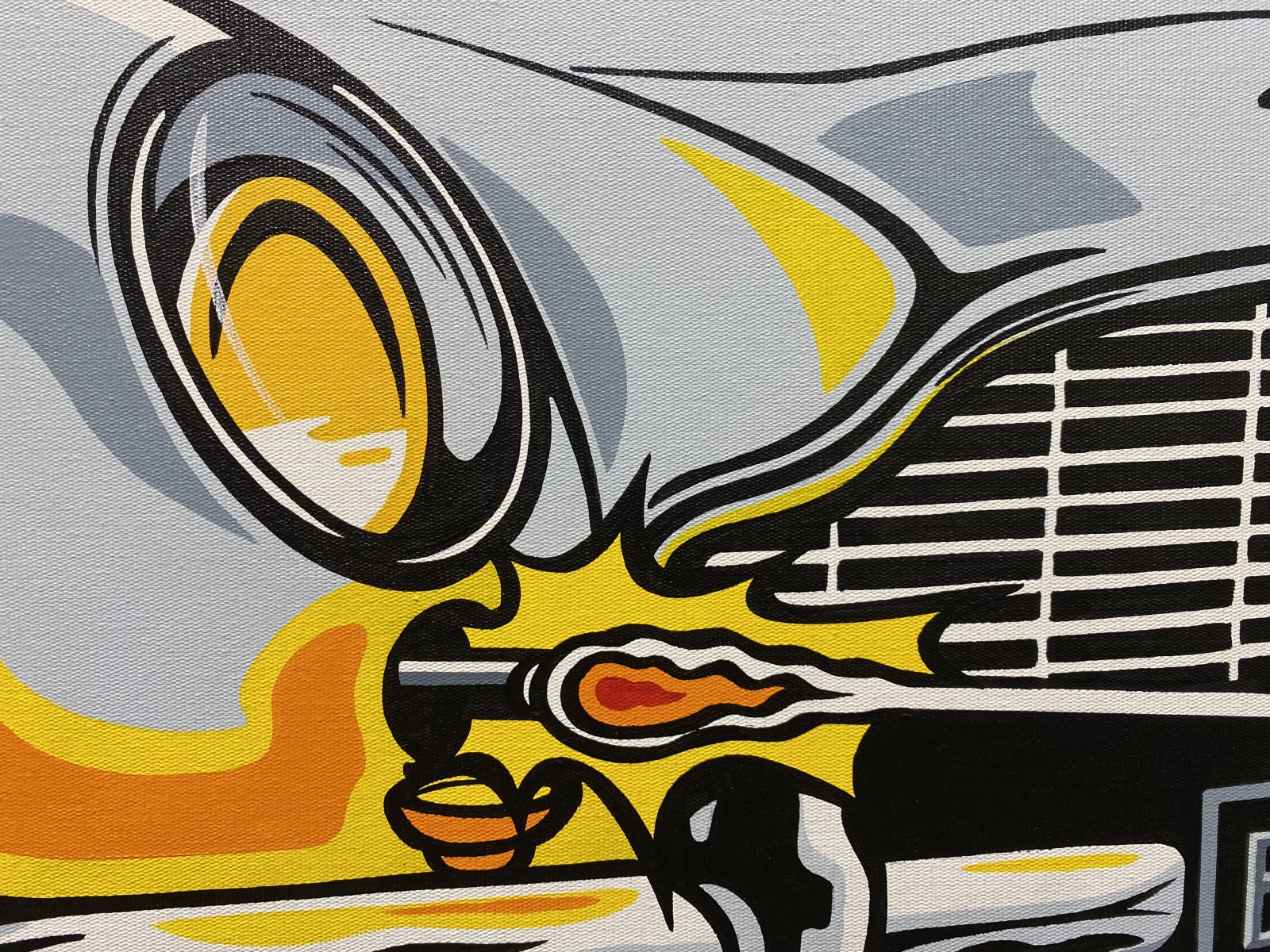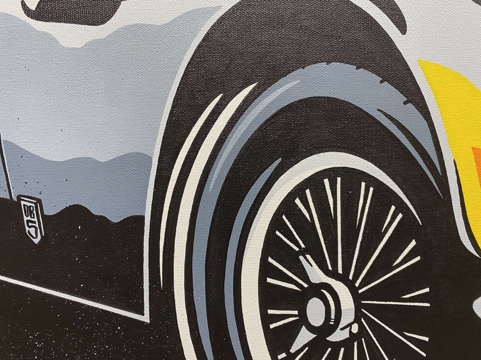 Comic book style painting of James Bond's original classic Aston Martin DB5. On this original model the front indicator lights flipped down to reveal twin machine guns. A dramatic scene where we see the car barely escaping a large explosion whilst blasting the baddies from the front. An instantly recognizable piece of pop culture hand painted in professional quality acrylic on stretched canvas, it's an escapade frozen in time, ready to rev up the ambiance of any space.