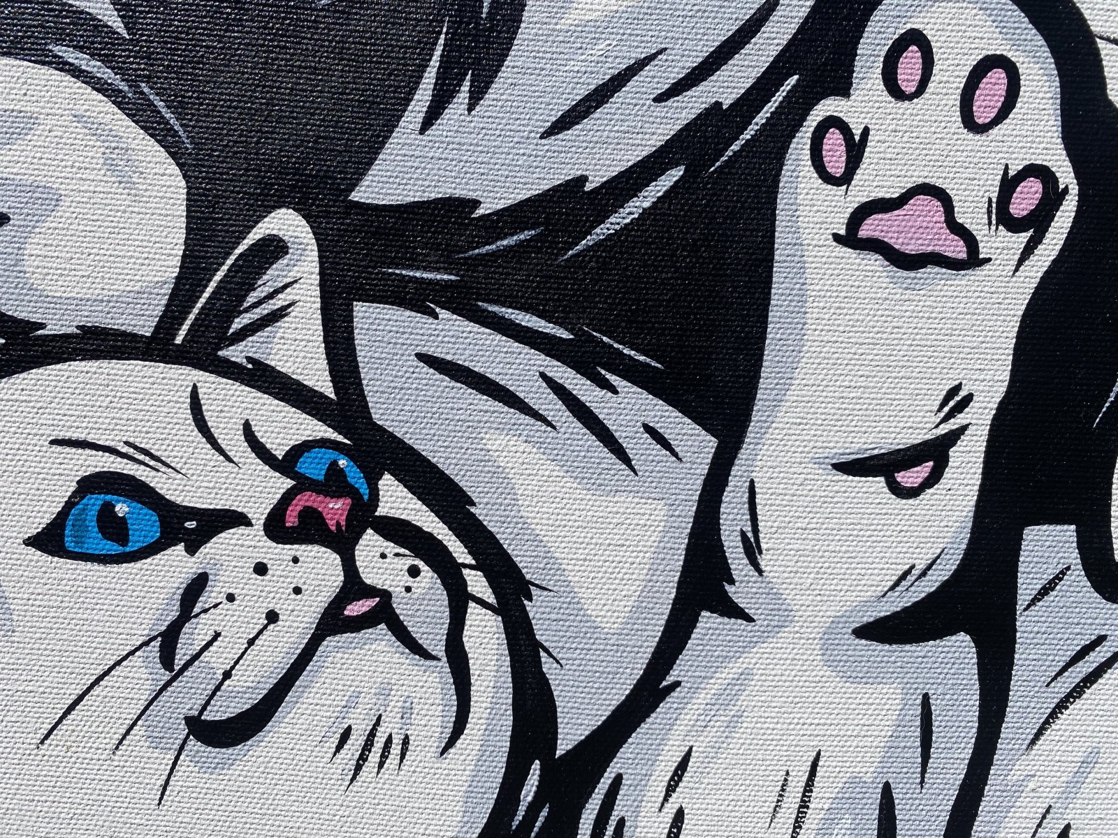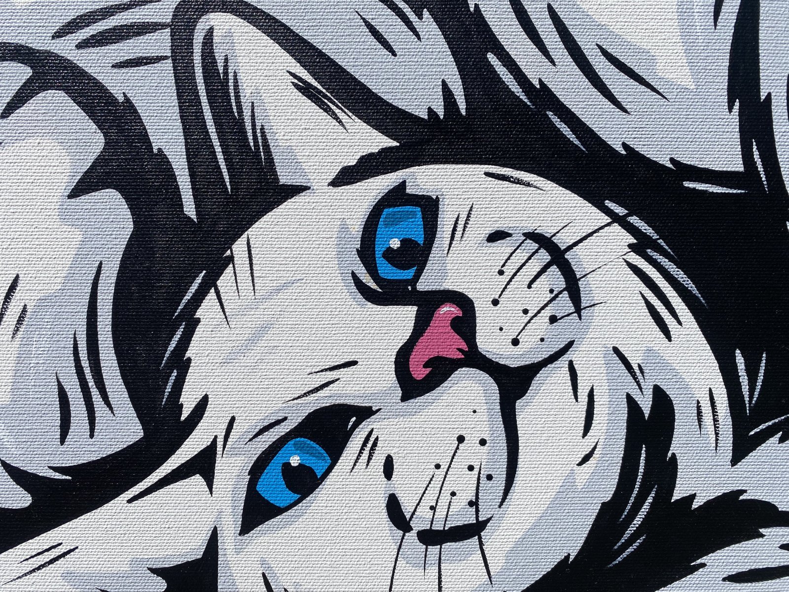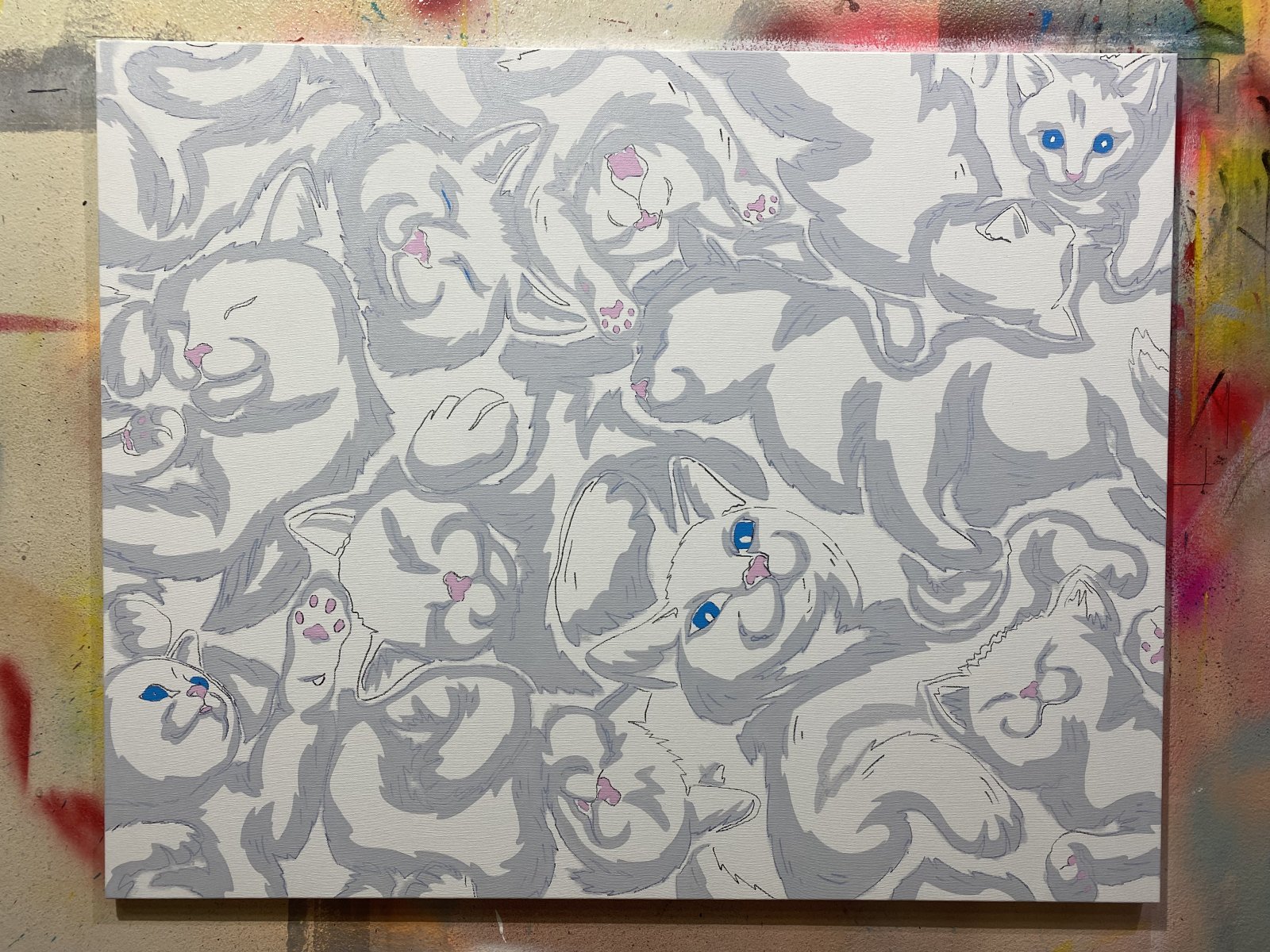 In this playful acrylic painting of white cats, I've unleashed a vibrant ensemble of whimsical felines, each brimming with personality and motion. Captured in a dynamic comic style, their bright eyes and expressive positions add a zesty pop art flair. This painting is great for any space as it can be hung portrait or landscape.