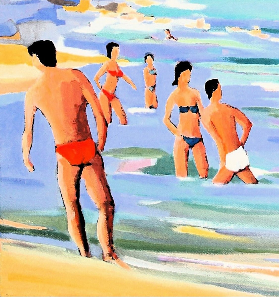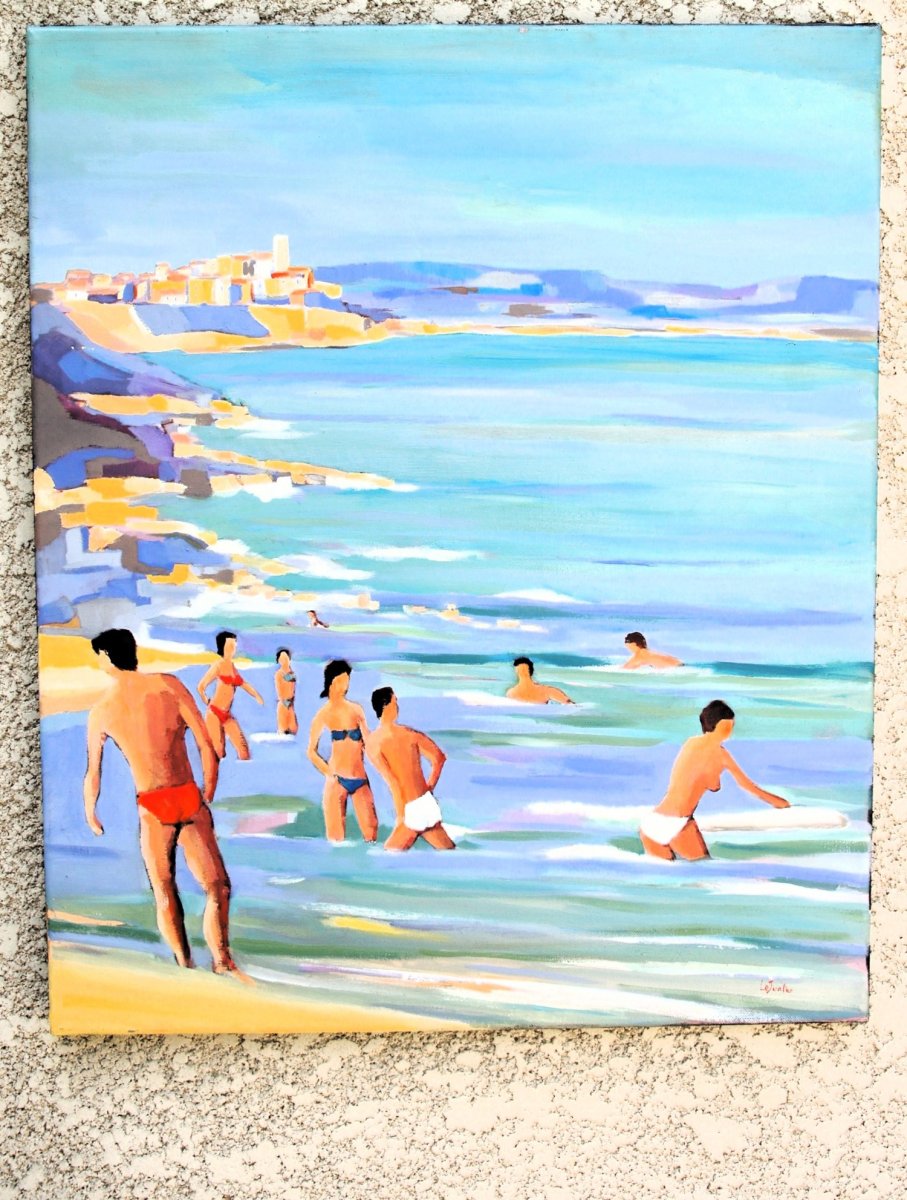 This oil painting depicts bathers on a beach in Antibes, with the city and its famous ramparts in the background, standing out against the Southern Alps. It was painted on a linen canvas based on sketches and watercolors made on location in September 2015. The technique of successive glazes (thin, almost transparent layers) gives it a great deal of luminosity. This artwork is ready to hang and has a discreet varnished wooden framed(see the last photo). It is also available unframed upon request.
