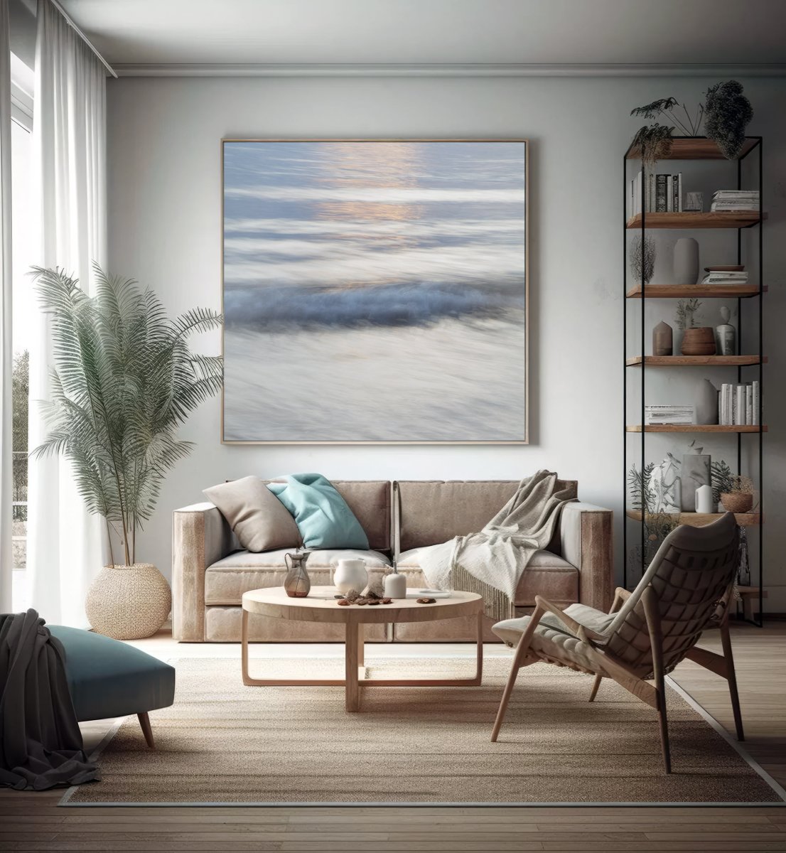 Gentle horizontal streaks blur the boundary between water and sky, so that the image hovers on the threshold of abstraction while remaining anchored in the memory of a shoreline.