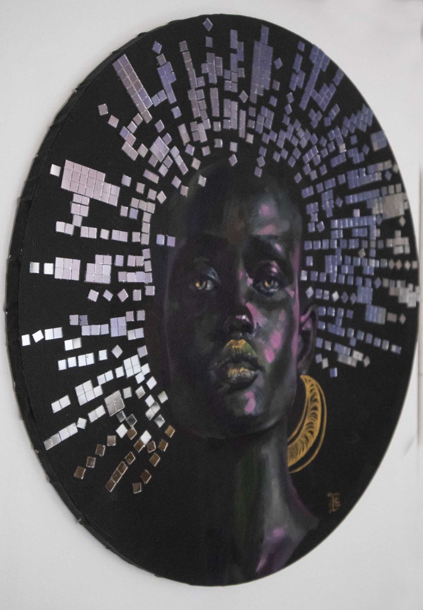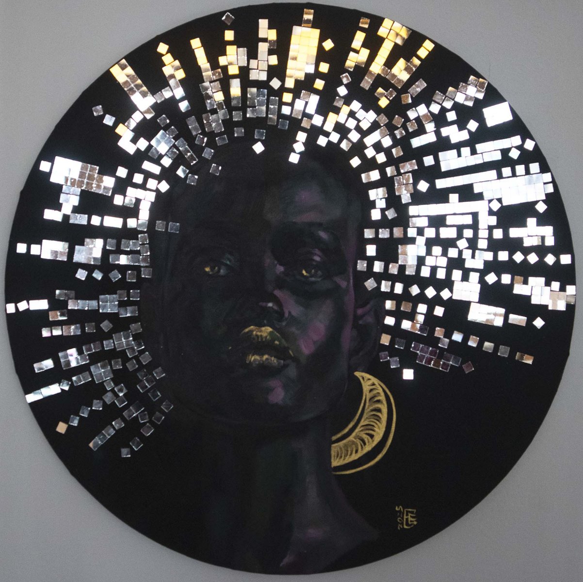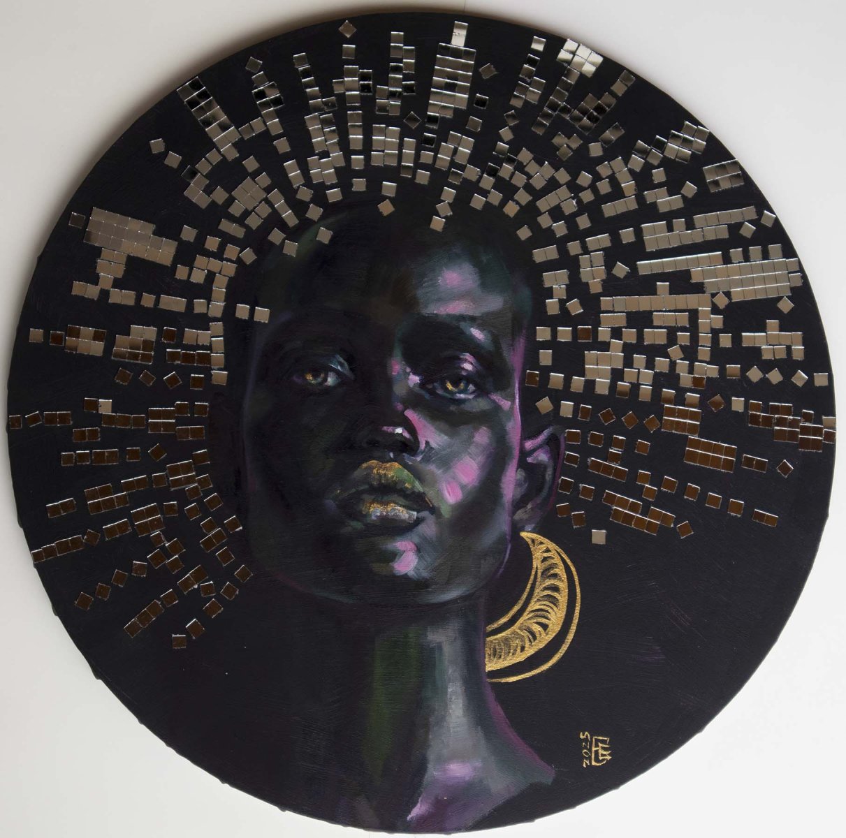 original oil painting with unique collage on canvas with circle shape