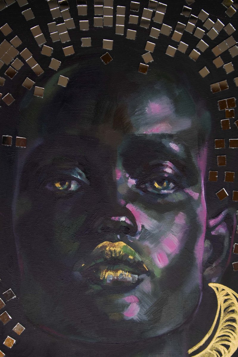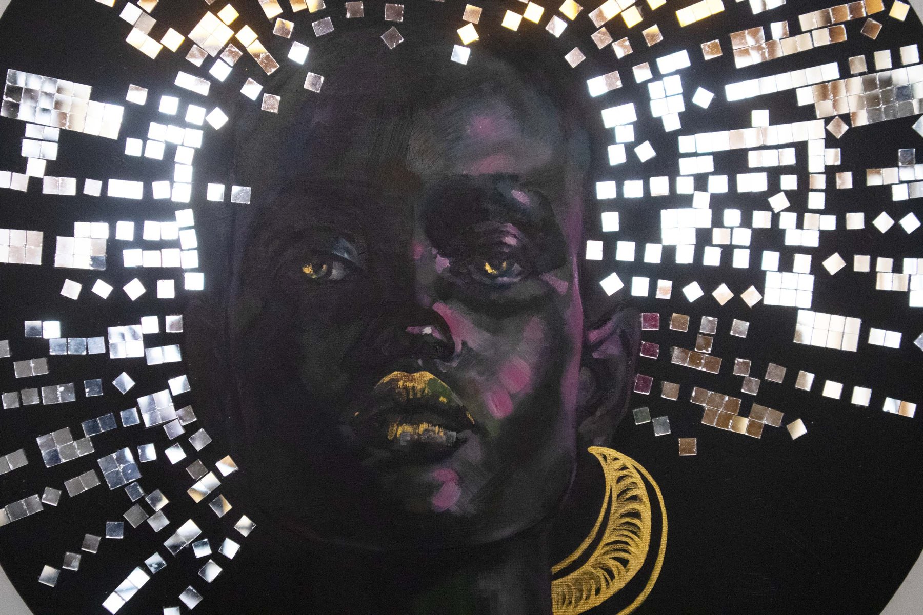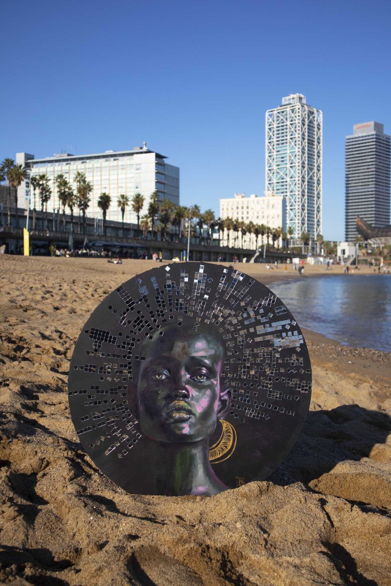 original oil painting with unique collage on canvas with circle shape