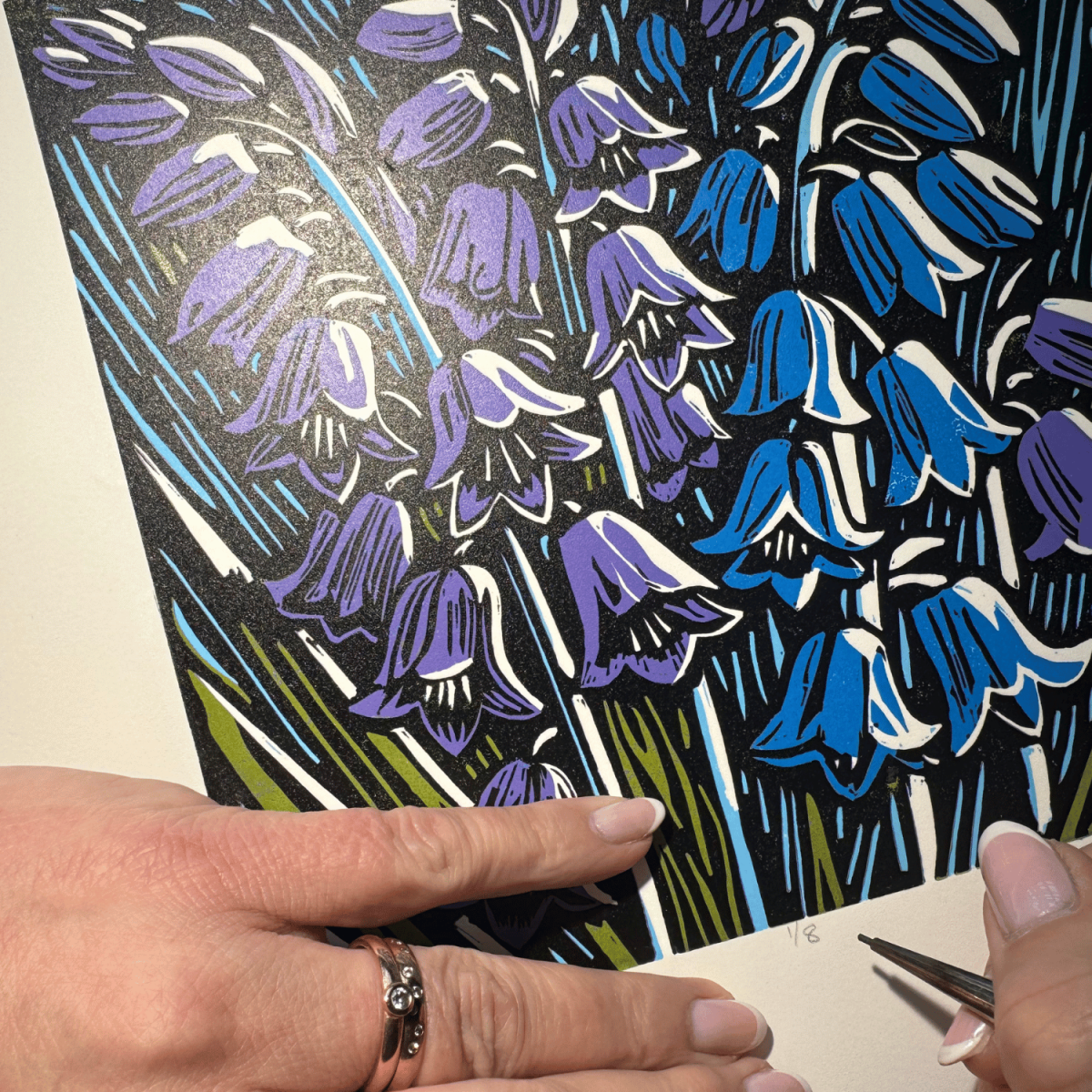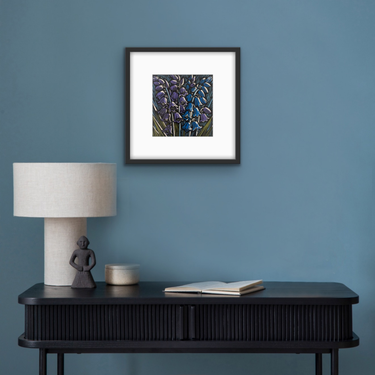 Through layered carving and hand printing, the colours build depth and rhythm across the composition. The contrast of cool blues and violets against the dark background allows the bluebells to glow softly, creating a sense of calm and quiet wonder.