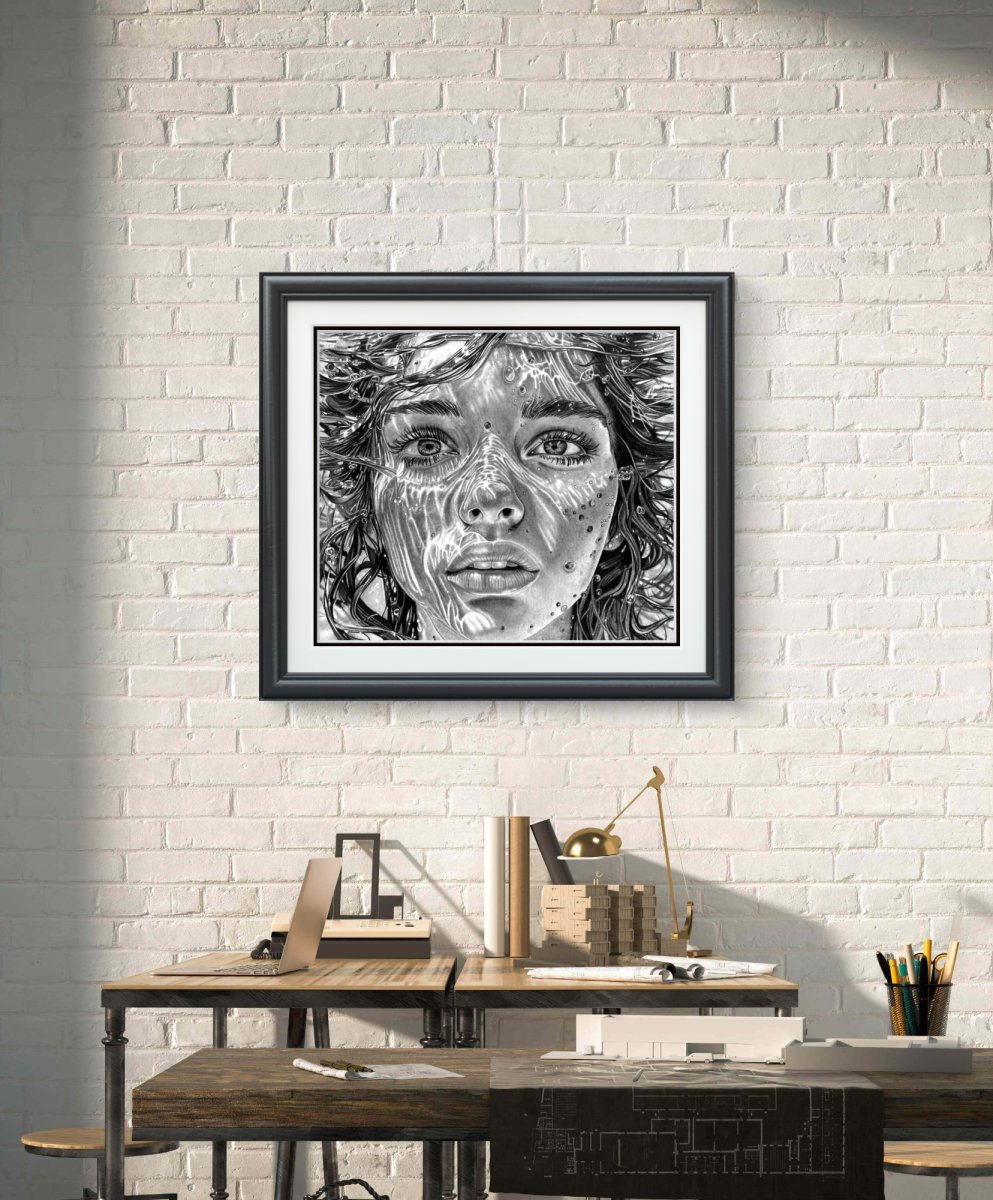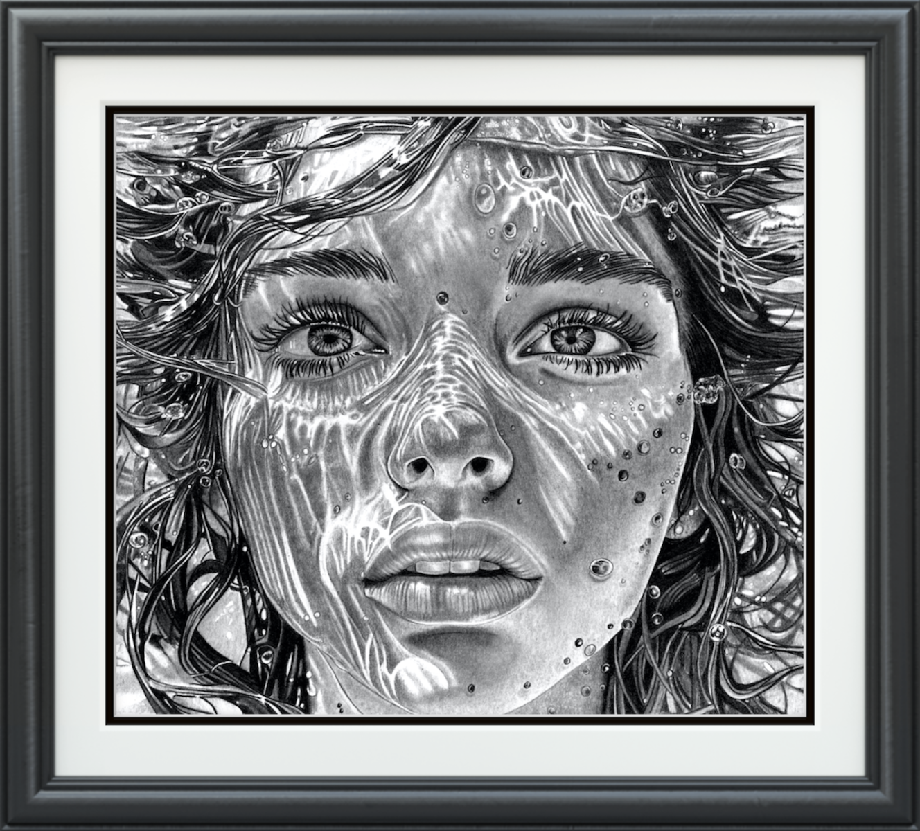 An original Pencil Drawing depicting a young woman under the clear water in this short series exploring light, reflection and shadows as the fall through and around water.