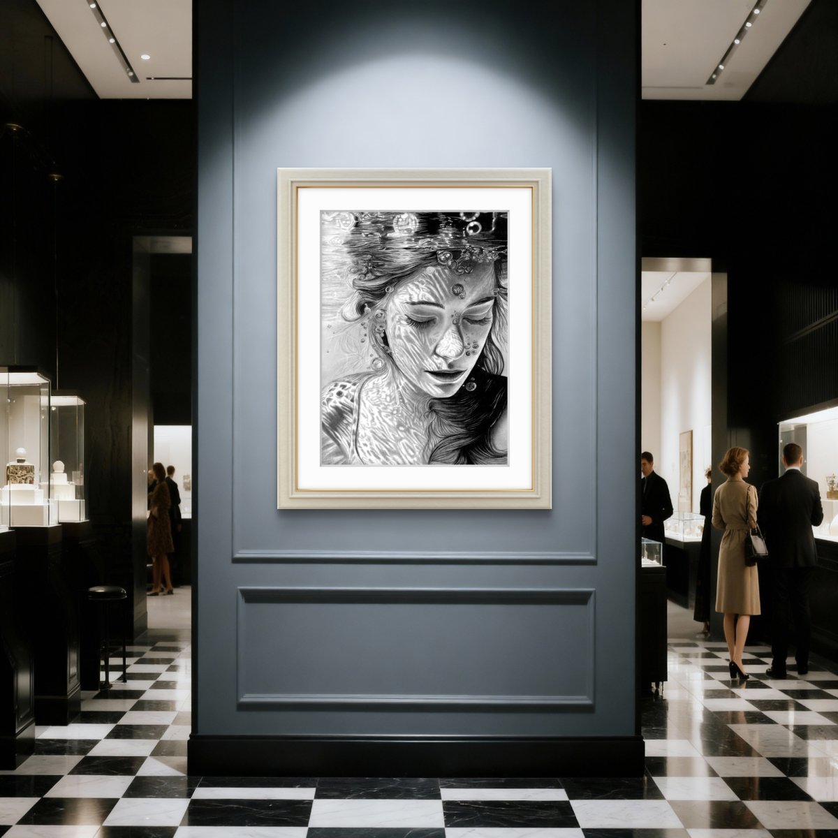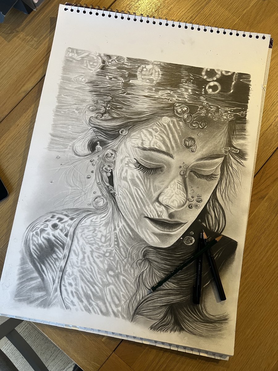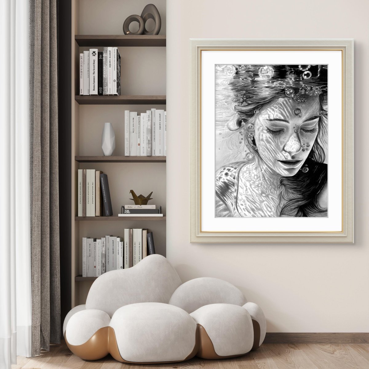 An original Pencil Drawing depicting a young woman under the clear water in this short series exploring light, reflection and shadows as the fall through and around water.