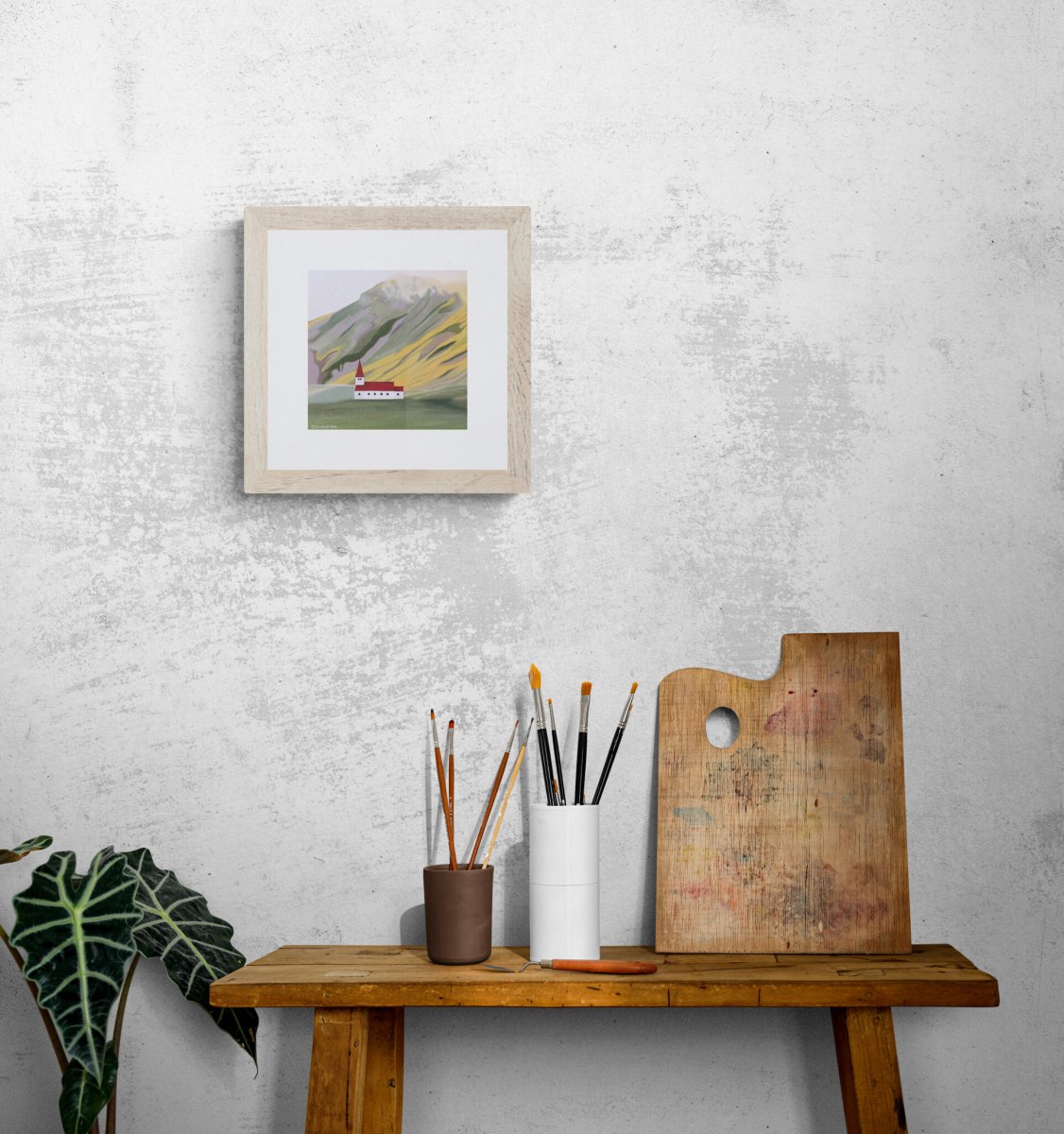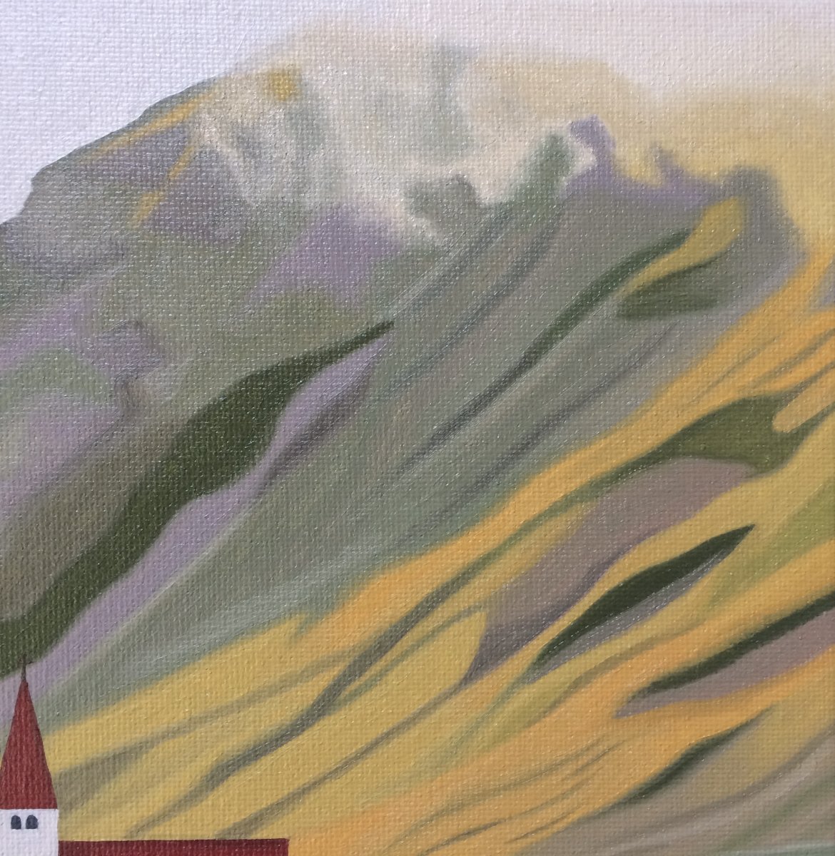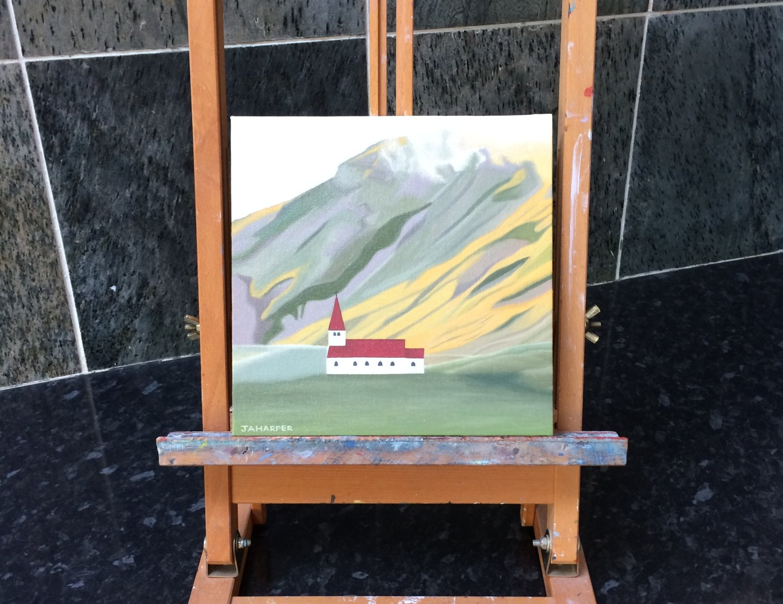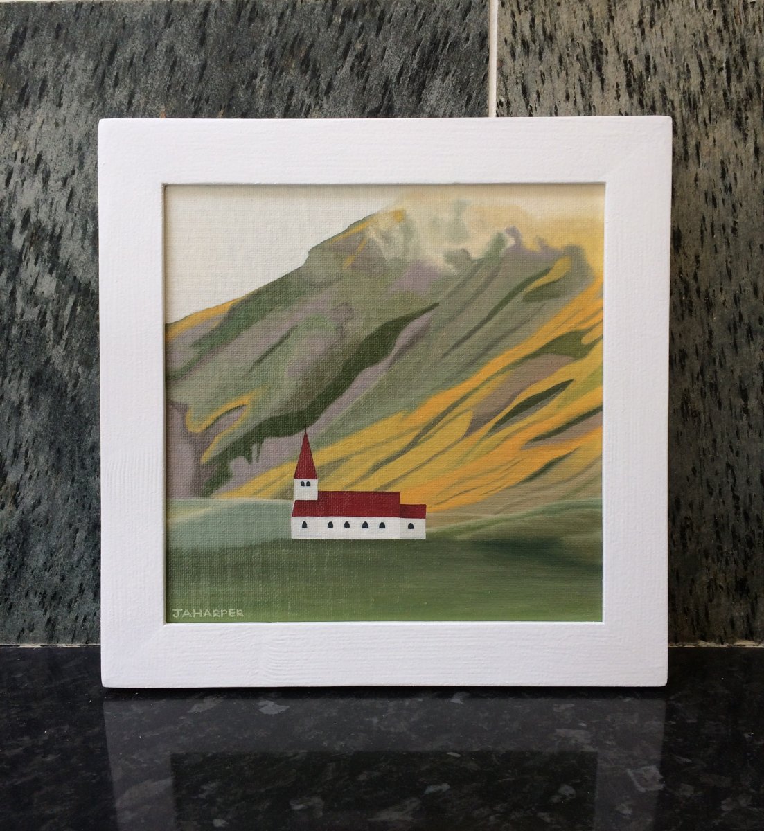 This painting was inspired by the iconic architecture of Vik i Myrdal church contrasted against the beautiful scenery of Iceland’s south coast. Beyond its role as a picturesque landmark, it is the designated emergency shelter for the community in the event of an eruption from the nearby Katla volcano, as its elevated position is believed to be the only area safe from potential glacial flash floods.