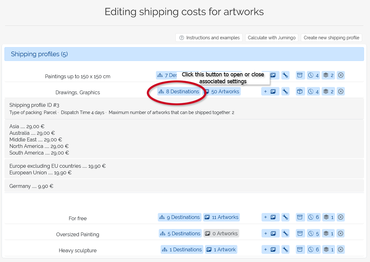 Screenshot: Some example settings for different artwork types to different destinations from Germany